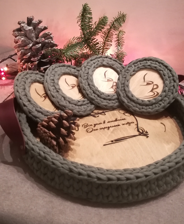 Вязанный поднос с подставочками для горячих кружечек чая или кофе. Мастер Avgusta-TV